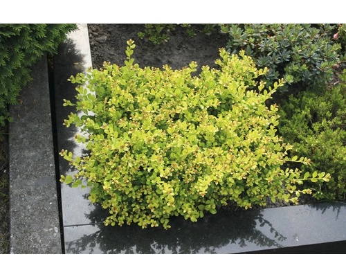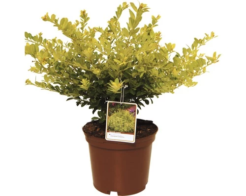 Kompakter immergrüner Kleinstrauch von FloraSelf. Insgesamt bleibt er eher klein und wächst mehr breit als hoch. Die Belaubung ist im Austrieb leuchtend goldgelb, später gelbgrün.