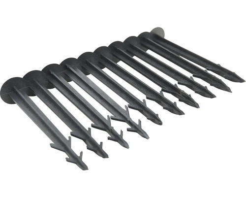 Diese schwarzen Bodenanker von FloraSelf sorgen für einen sicheren Halt von Folien und Vliesen im Erdreich. Sie sind 12 cm lang, bestehen aus stabilem Kunststoff, sind wetterfest und wiederverwendbar. Die Packung enthält 10 Stück.