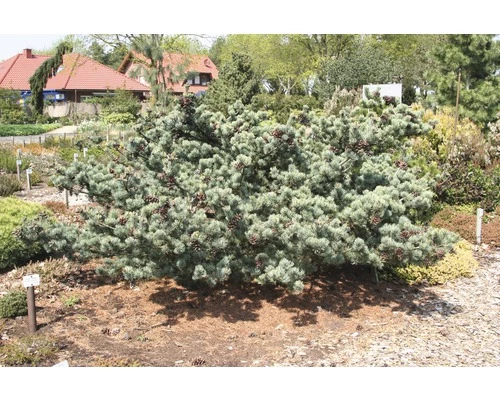 Die Bonsai-Mädchenkiefer von FloraSelf wächst baumartig, locker aufrecht. Typisch sind lange, kurz benadelte Triebe, die sich erst am Triebende wieder verzweigen. Dadurch hat sie von Natur aus einen bonsaiartigen Aufbau. Die Benadelung ist ganzjährig silberblau bis blaugrün.
