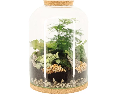 Ist Dein Flaschengarten mit einem Deckel luftdicht verschlossen, nennt man das Hermetosphäre. Das Besondere: Durch das komplett geschlossene Ökosystem geht die Pflege des Flaschengartens gegen Null. Bei Sukkulenten bleibt das Gefäß offen.