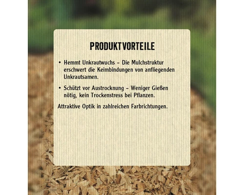 Sie beugen Wasserverdunstung und Bodenverkrustung vor. Zudem schützt Sie die Gartenerde vor Erosion durch Wind und Wasser sowie vor direkter Sonneneinstrahlung. Die Schicht ist zudem ein natürlicher Schutz vor Unkräutern. Das hochwertige Holzdekor verhindert die Keimung von Unkrautsamen. Ihre Gartenpflanzen werden dadurch vor Konkurrenten um Wasser und Nährstoffe geschützt. So können Sie sich viele Arbeitsstunden sparen, die Sie mit Jäten verbringen müssten. Im Winter schützt Holzdekor den Boden – quasi wie ein Mantel – vor starkem Frost.