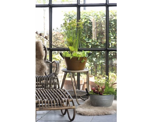 | Botanischer Name | Miniteich mit Pflanzen Ø 40 cm Zink-Schale rost |